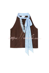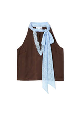 • Designed to be worn both ways, this top elevates any outfit! The tie fastenings in a gorgeous blue lace, that continues into the neckline, beautifully contrasts the deep chocolate brown top making the piece feel super luxe and premium. Pair with the matching skirt of a chic co-ord or tone down with some scallop jeans and a heel.