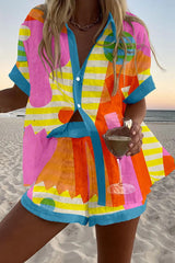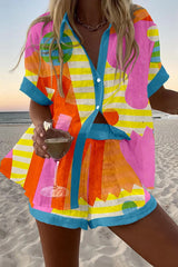 Color Block Print Loose Button Elastic Waist Shorts Set