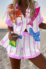 Colorful Marine Life Print Loose Button Elastic Waist Shorts Set
