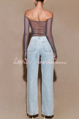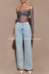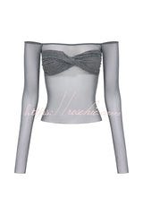 - Designed with a bardot neckline and long sleeves, this top showcases an alluring off-shoulder style that highlights your collarbone. The mesh fabrication gives it a modern, sultry look, while the diamante-encrusted bust adds a touch of sparkle and luxury. A twist front detail enhances its unique style, making this top perfect for elevating your evening look with effortless sophistication.