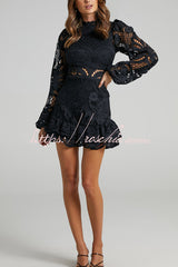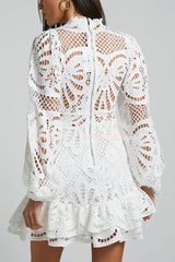 Solid Color Hollow Long-sleeved Waisted Lace Mini Dress
