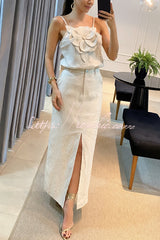 Charming Lady Linen Blend Floral Embellishment Tank and High Rise Pocketed Slit Skirt Set