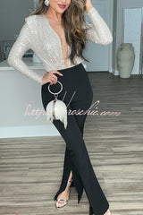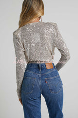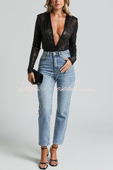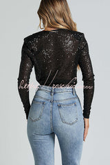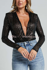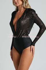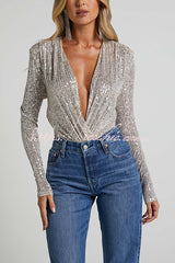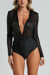 Alora Sequin Wrap Front Plunge Neck Long Sleeve Bodysuit
