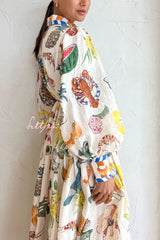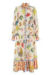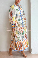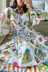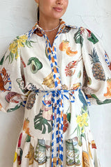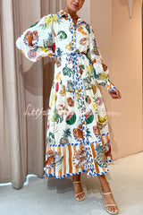 Hopeful Moments Tropical Fruit Print Balloon Sleeve Patchwork Shirt Midi Dress