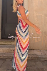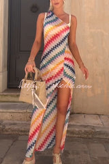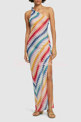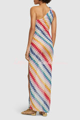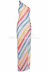 Vacay Charm Knit Colorful Zigzag Pattern One Shoulder Slit Maxi Dress