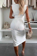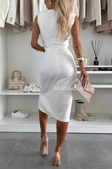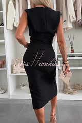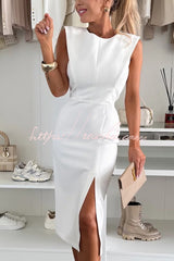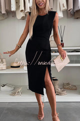 Charming Lady Solid Color Round Neck Sleeveless Waisted Slit Stretch Midi Dress