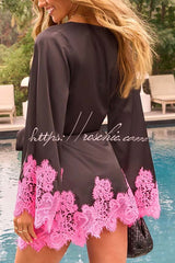 Joyful Bond Satin Lace Trim Contrast Color Bell Sleeve Tie-up Kimono Mini Dress