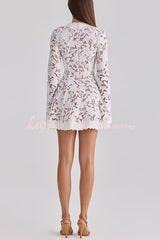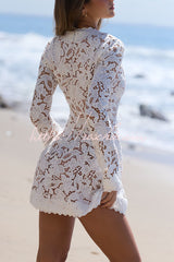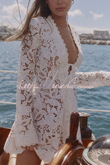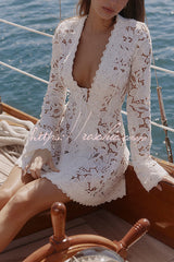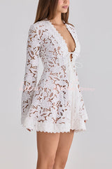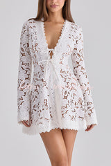 Bianca Lace Floral Pattern Lace Trim Tie-up V-neck Long Sleeve Mini Dress