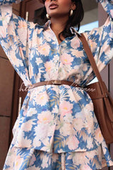 Botanical Print Collared Long-sleeved Loose-fitting Shirt and Elastic Waist Casual Shorts Set