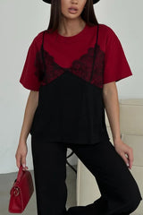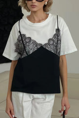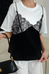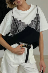 Fashionable Lace Patchwork Loose-fitting Round Neck Short-sleeved T-shirt