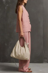 Linen Blend V-neck Sleeveless Button-down Vest and Casual Elastic Waist Pocket Wide-leg Pants Set