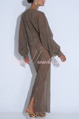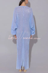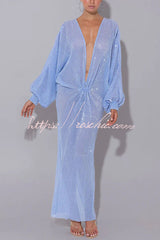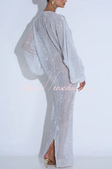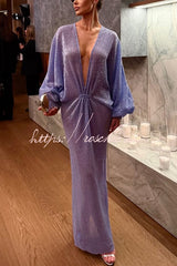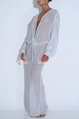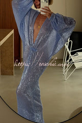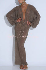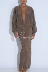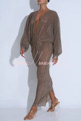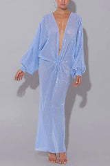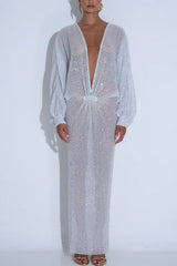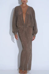 Modern Elegance Sequin Sheer Long Relaxed Sleeve Ruched Drape Maxi Dress