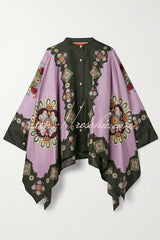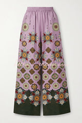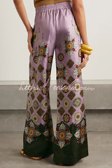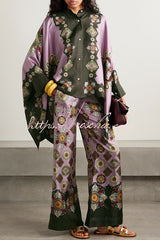 Satin Unique Print Loose Batwing Sleeve Top and Elastic Waist Pocket Casual Wide-leg Pants Set