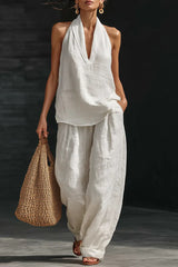 Linen Blend Solid Color V-neck Sleeveless Loose Top and Elastic Waist Casual Pocket Pants Set