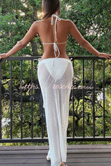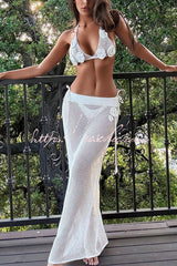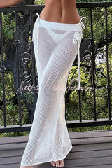Three-dimensional Crochet Flower Halter Neck Top and Stretchy Fitted Knit Maxi Skirt Cover-up Set
