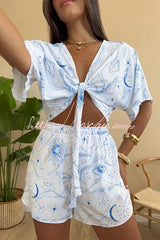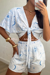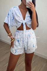 Unique Printed V-neck Short-sleeved Tie-front Top and Elastic Waist Casual Shorts Set