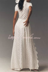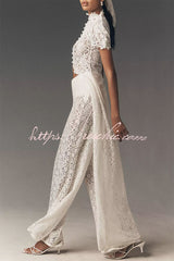 Elegance Avant-garde Floral Lace Short Sleeve High Low Top and High Rise Wide Leg Pants Set