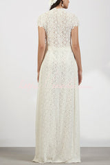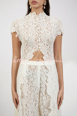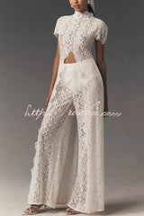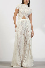 - This white lace set perfectly blends timeless elegance with modern fashion. The long-sleeved, high-neck top features delicate lace fabric and a daring cutout design that opens completely from the waist down, creating a dramatic silhouette. Paired with matching lace flared trousers, this set is both feminine and avant-garde, making it ideal for various occasions, from festive celebrations to upscale dinners, ensuring you'll be the center of attention.Our distinctive clothing will add instant style to your wardrobe.