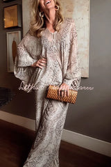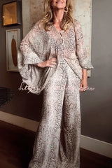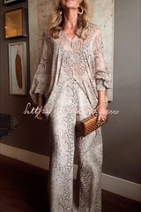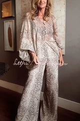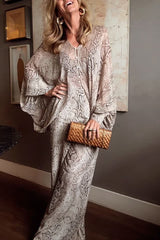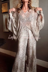 Iselle Animal Print Button Up Batwing Sleeve Shirt and Elastic Waist Wide Leg Pants Set