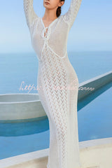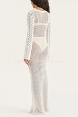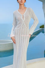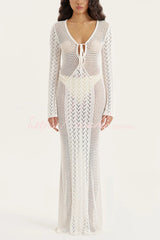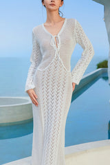 Solid Color Hollowed-out Long-sleeved V-neck Slim-fit Cover-up Maxi Dress