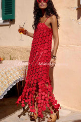 Juju Embroidered Cutout Polka Dots Square Neck Tassel Hem Slip Maxi Dress