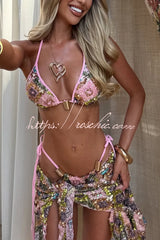 Stylish Sequined Metal Decoration Halter Neck Tie Stretch Bikini Swimsuit and Beach Cover-up Mini Skirt Three-piece Set