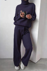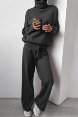 Solid Color Turtleneck Long-sleeved Knit Top and Elastic Waist Casual Pants Set