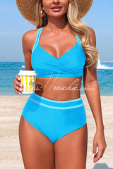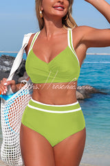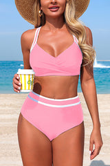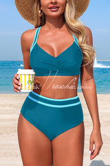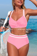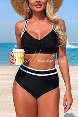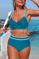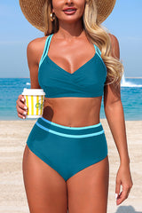 Stylish Color-blocked Striped High-waisted Two-piece Stretch Bikini Swimsuit