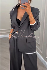 Fashion Sports Style Ribbed Colorblock Lapel Blazer and Elastic Waist Pocket Loose Pants Set
