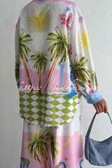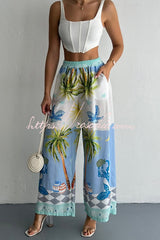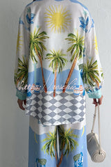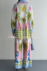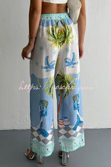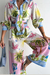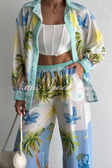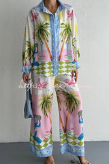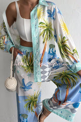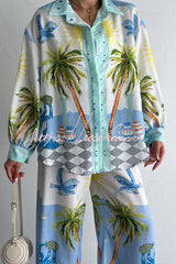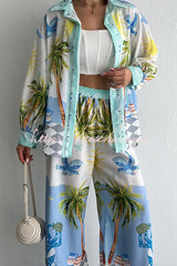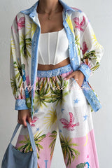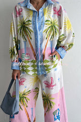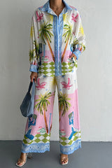 Holiday Style Print Loose Long Sleeve Shirt and Elastic Waist Loose Pocket Wide Leg Pants Set