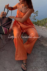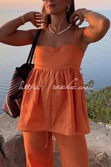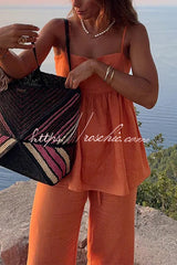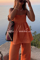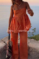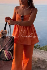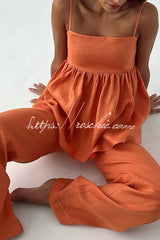 Solid Color Casual Suspender Loose Top and Elastic Waist Wide Leg Pants Set