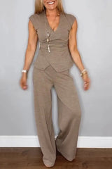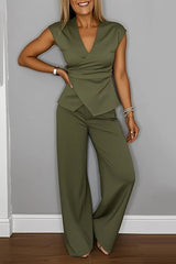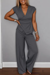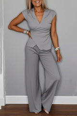 Solid Color V-neck Metal Buttoned Pleated Top and Casual Straight Pants Set