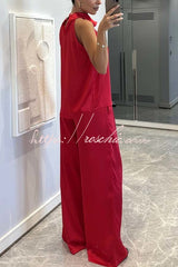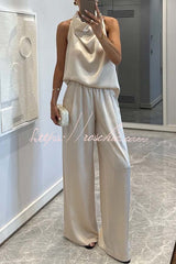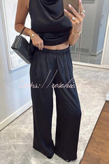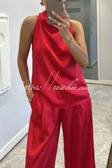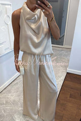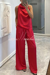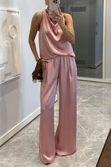 Classic on You Satin High Cowl Neck Top and Elastic Waist Pocket Loose Pants Set
