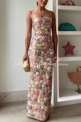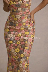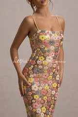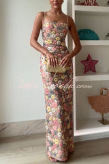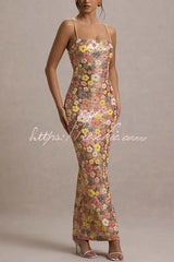 80's Inspired Floral Print Sequin Square Neck Slip Stretch Maxi Dress