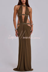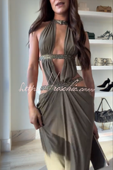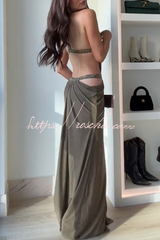 Khaki Hot-fix Rhinestone Shoulder Strap Cutout Design Backless Drape Maxi Dress