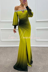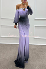 Julieta Gradient Print Boat Neck Off Shoulder Gem Detail Slit Gown Maxi Dress