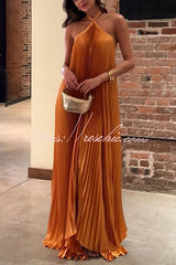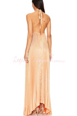 - Dramatic pleats rise along the length of the gown, creating a sophisticated silhouette that's agile and dynamic. Featuring a sophisticated halter neckline, modern inverted hem and open back design. A striking gown that exudes unwavering luxury.