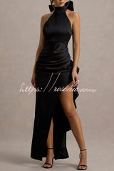 - Defined by timeless sophistication and graceful detail, Maureen is a captivating choice for your most elegant occasions. Crafted from our premium satin in a sleek black hue, this maxi dress features a refined high-neckline that exudes understated glamour. The draped bodice flows effortlessly into a figure-skimming silhouette, while a subtle side split adds a hint of allure.Our distinctive clothing will add instant style to your wardrobe .