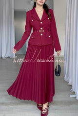 Solid Color Lapel Button Belt Blazer and Pleated Casual Maxi Skirt Set