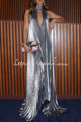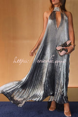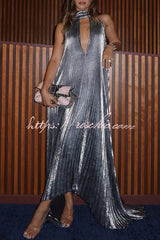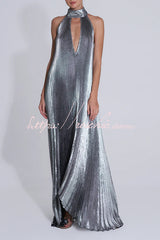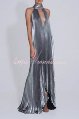 Celebration Party Pleated Metallic Fabric High Deep V-cutout Halter Neck A-line Maxi Dress