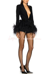 Party Time Feather Trim Design Deep Lapel V-Neck Long Sleeve Stretch Romper