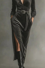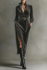 Solid Color Long-sleeved High-waisted Belted Casual Pocket Midi Dress
