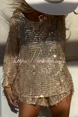 Fashion Sequin Round Neck Long Sleeve Tassel Top and Elastic Waist Casual Shorts Set