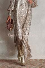 Minimalist Sparkling Sequin V-neck Long Balloon Sleeve Slit Party Maxi Dress