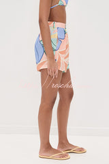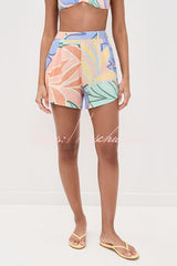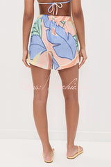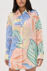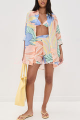 Bella Linen Blend Colorful Unique Print Long Sleeve Blouse and Elastic Waist Pocket Loose Shorts Set