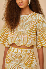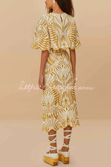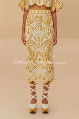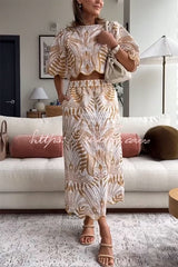 Korra Linen Blend Unique Print Wave Trim Bell Sleeve Top and Elastic Waist Pocket Midi Skirt Set