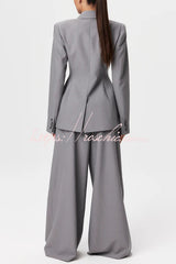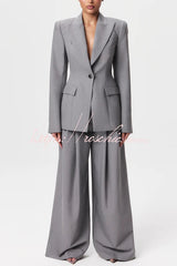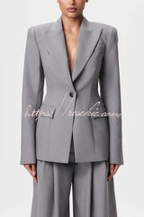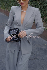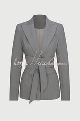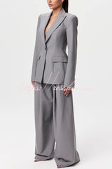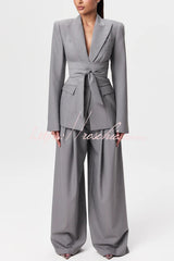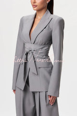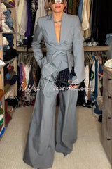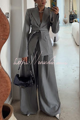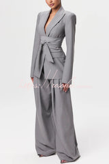 - Tailored suiting reimagined and modernized. Our body accentuating blazer is designed with a notched collar and lapel, front button closure and a detachable belt at the waist to accentuate your frame. Style with our matching wide-leg suited pant to complete the look. Our distinctive clothing will add instant style to your wardrobe.