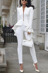 Emmie Stand Collar Ruffle High Low Hem Blazer and High Rise Stretch Pencil Pants