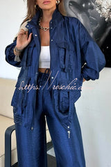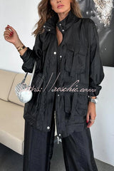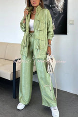 Easy on Me Metallic Fabric Flap Pocket Cargo Style Zipper Loose Jacket (Shipped Within 24 Hours)