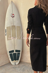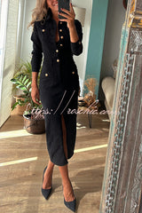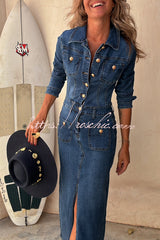 Tessy Denim Metal Button Zipper Shirt Stretch Pencil Slit Midi Dress